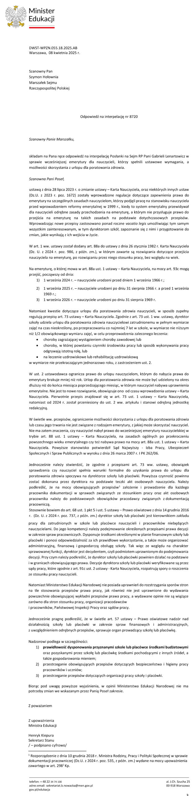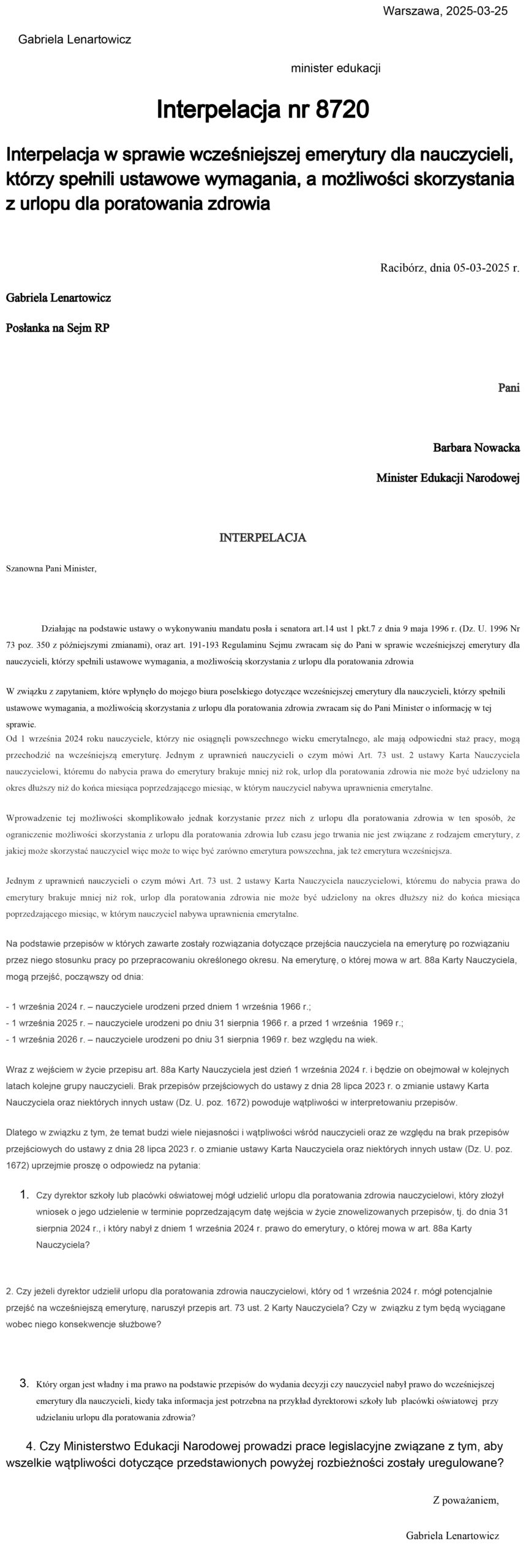 Interpelacja dotyczy rozbieżności w przepisach dotyczących prawa nauczycieli, którzy nabyli tytuł do emerytury o wykorzystania urlopu dla poratowania zdrowia. Poniżej tekst interpelacji i odpowiedź ministerstwa.
